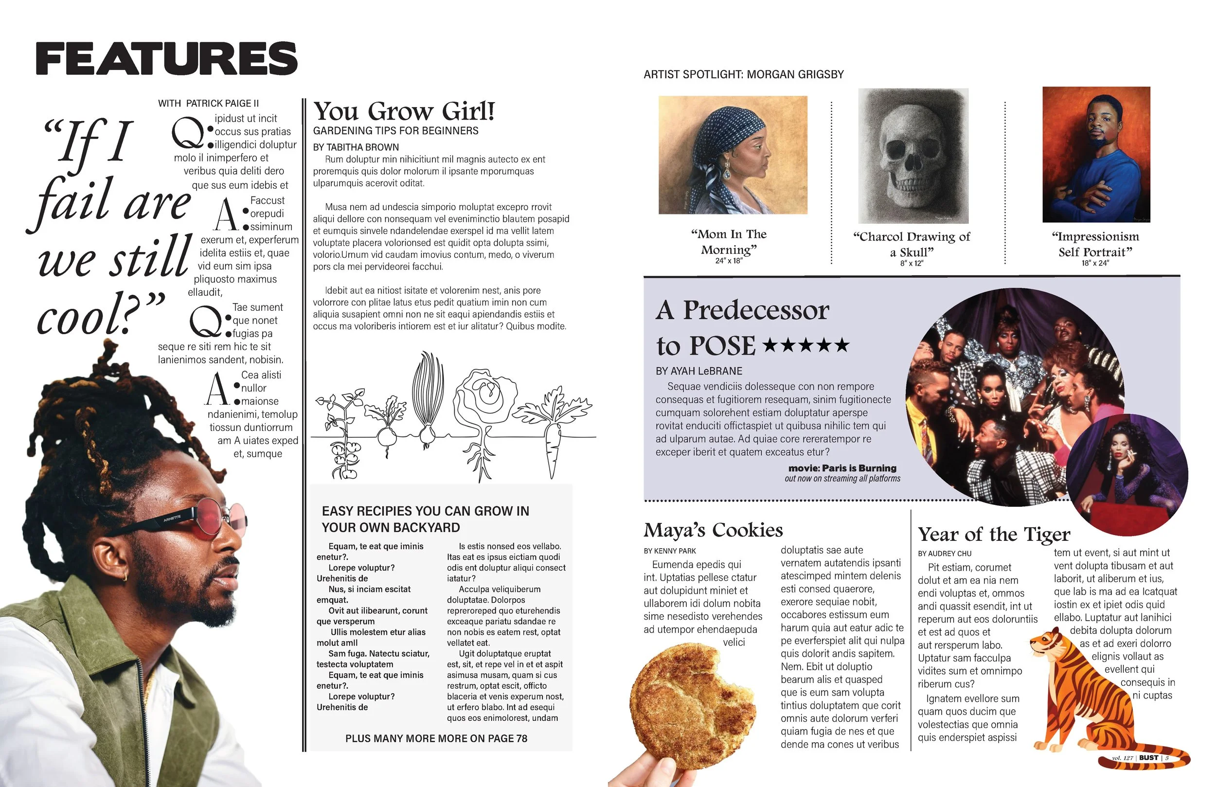 As a final project in a design class I took at university, I was tasked with redesigning a magazine. For the project, I had to include two cover options, a table of contents, a front-of-book, two full-page ads, a feature story, two smaller feature stories, and a masthead.