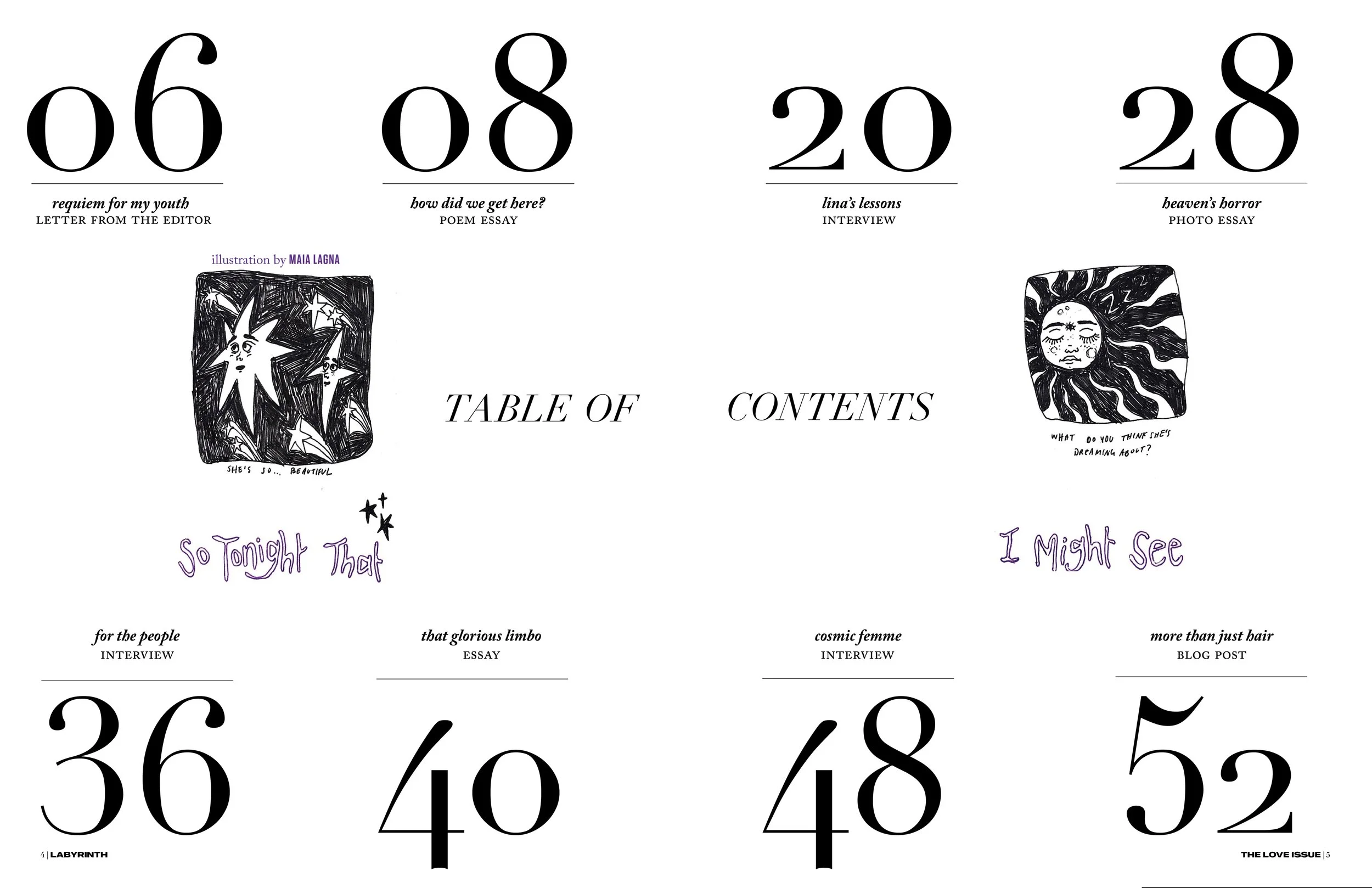 Labyrinth was a campus magazine founded by a friend and UO alumni. It is a collection of stories, poems, art, and interviews centered around BIPOC people and their experiences. I had the honor of designing the entirety of Labyrinth’s first print issue, and these are some of my favorite spreads.